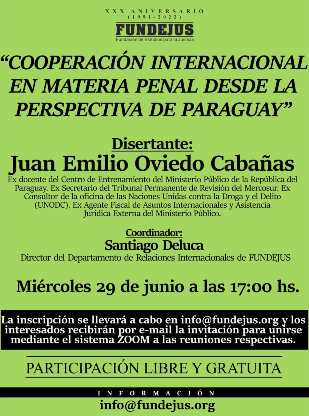 Disertante: Juan Emilio Oviedo Cabañas Miércoles 29 de junio 17 hs. •Participación libre y gratuita• Plataforma virtual Zoom Informes e inscripción a través del correo: info@fundejus.org Fundejus