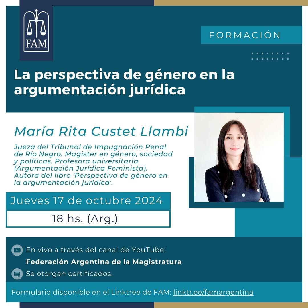 ✔️? FORMACIÓN FAM ▶️ Próxima charla: “La perspectiva de género en la argumentación jurídica” ? María Rita Custet Llambi ?Jueves 17 de octubre ?18 hs. (??) ?Transmisión en VIVO a…