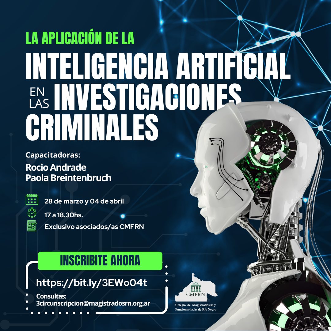 ? Nueva capacitación exclusiva para Asociados/as al Colegio de Magistrados/as y Funcionarios/as de Río Negro: *”INTELIGENCIA ARTIFICIAL EN LAS INVESTIGACIONES CRIMINALES”* ? viernes 28/03/25 y 04/04/25. ⏰ 17:00 a 18:30…