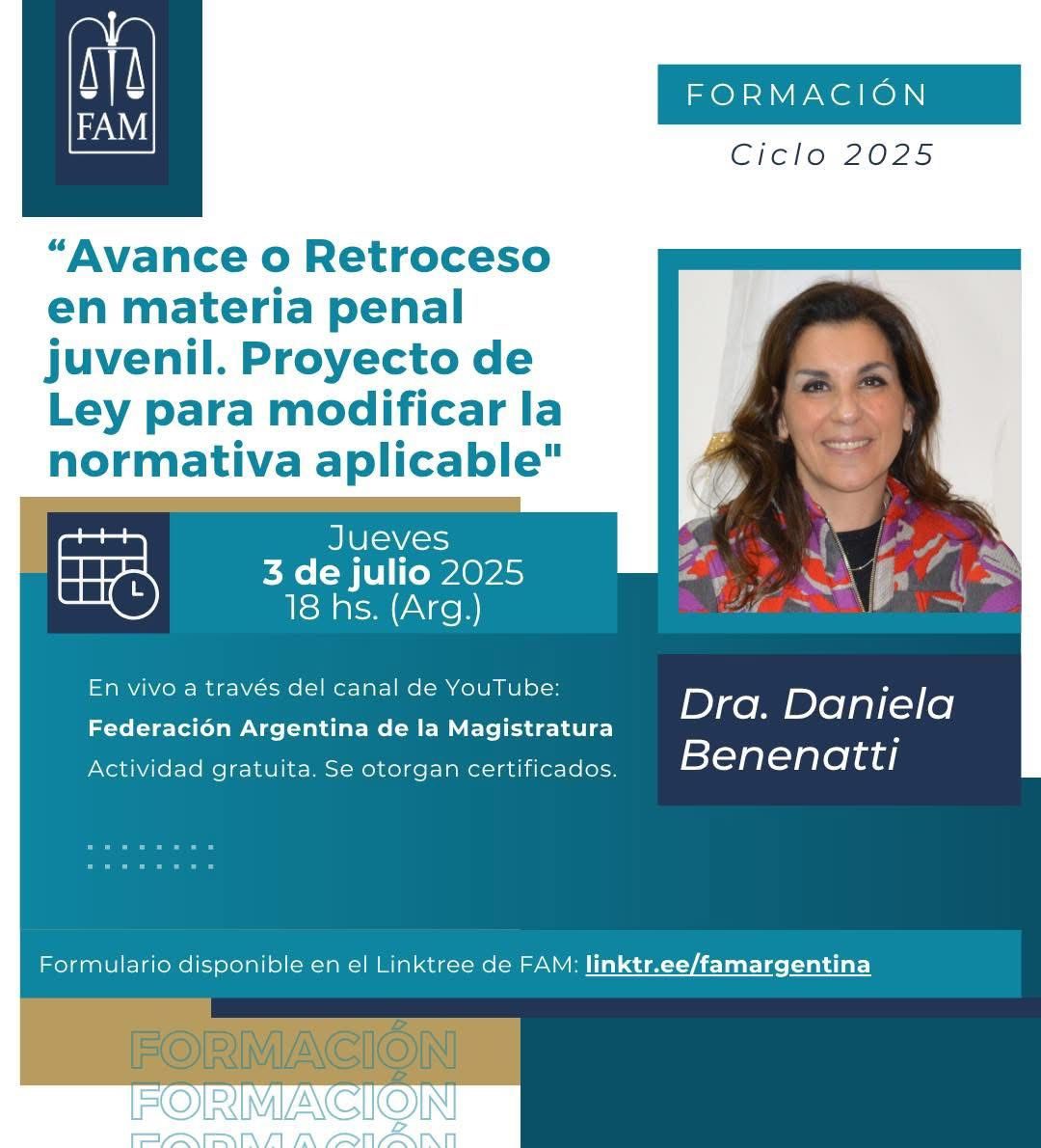 Hoy Nuevo encuentro de FORMACIÓN FAM🧑🏻💻 “Avance o Retroceso en materia penal juvenil. Proyecto de Ley para modificar la normativa aplicable” 🗓️ Jueves 3 de julio de 2025 🕕 18…