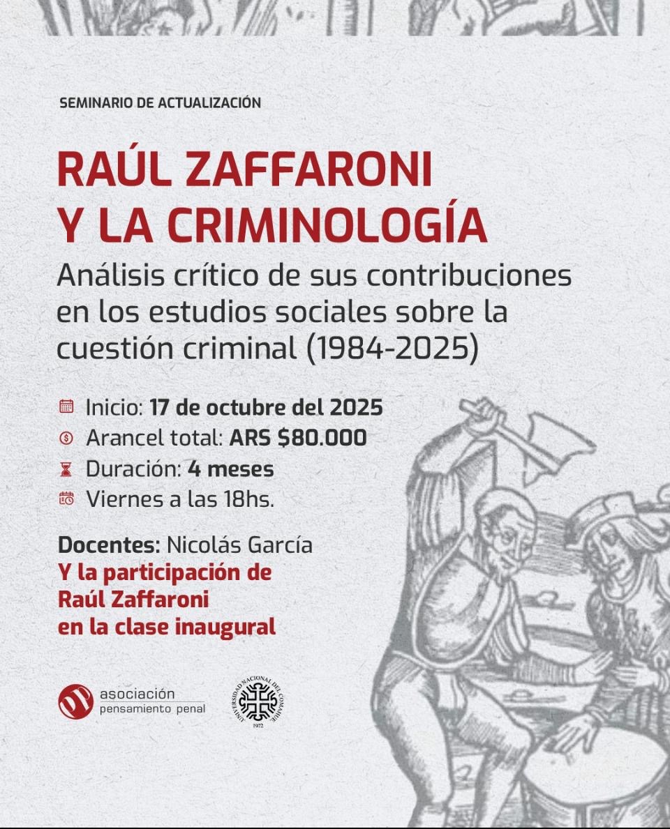 🔔 Nuevo curso online: Raúl Zaffaroni y la criminología Un espacio de análisis crítico sobre las contribuciones de Zaffaroni a los estudios sociales de la cuestión criminal (1984-2025). 📚 Docente:…
