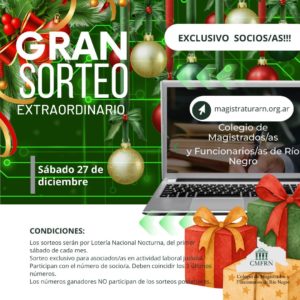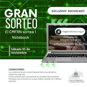 El próximo sábado 27 de diciembre se realizará un sorteo especial de una notebook, como nuevo beneficio exclusivo para asociados/as en actividad judicial. El CMFRN informa la realización de un